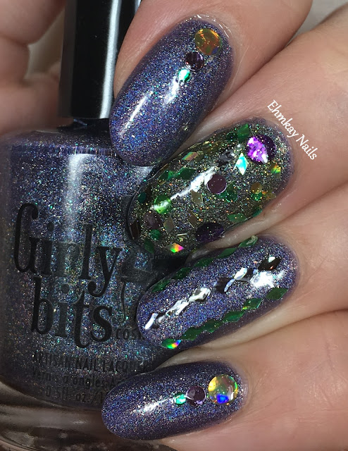Girly Bits Flash Your Tips was released in A Box, Indied in 2014 and is was to celebrate Mardi Gras. LOL big time at the name! My stash list tells me I actually won this in a giveaway, woo hoo! It's a light purple holo with green and gold flecks.