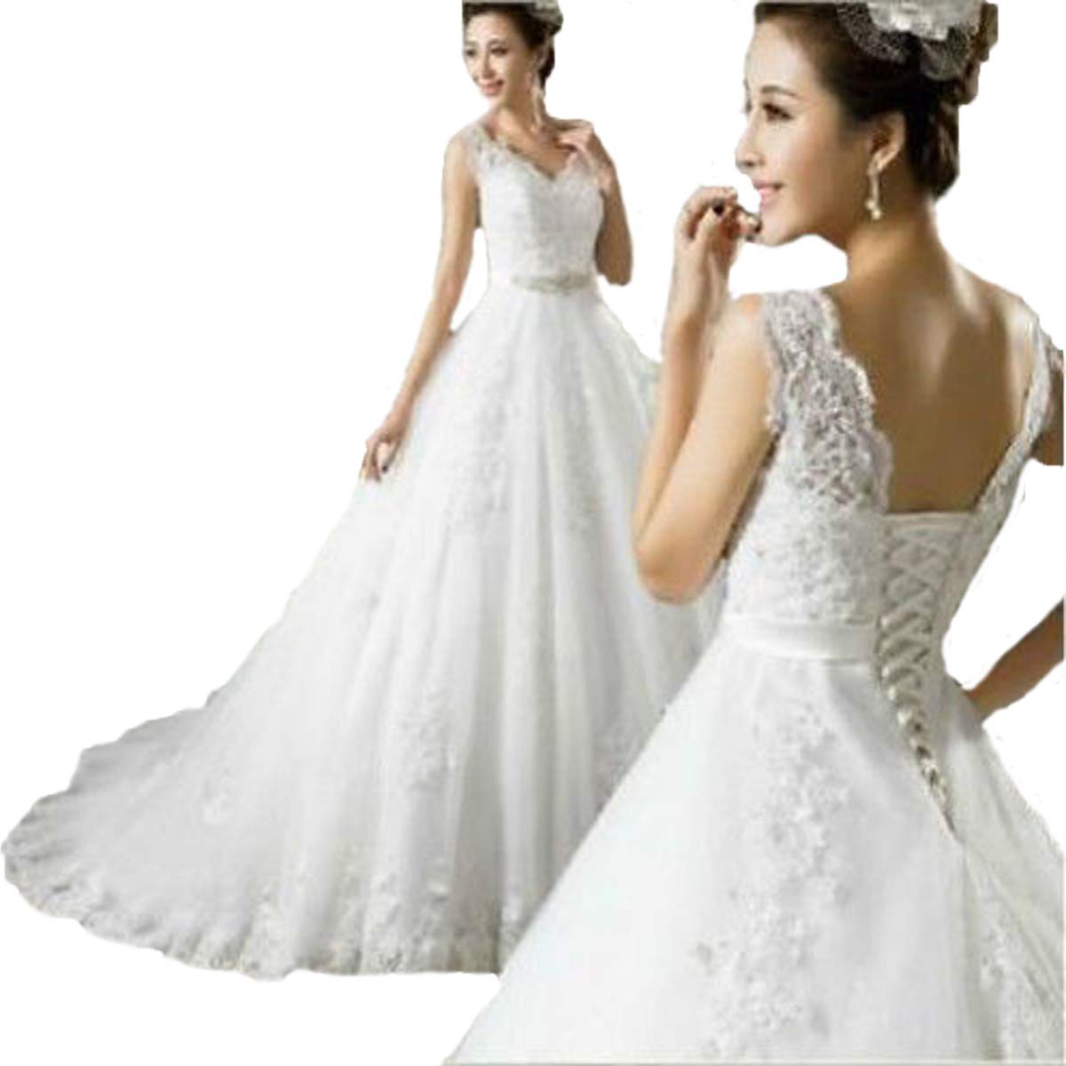 V Neck Open Back Lace Sleeveless Wedding Dress