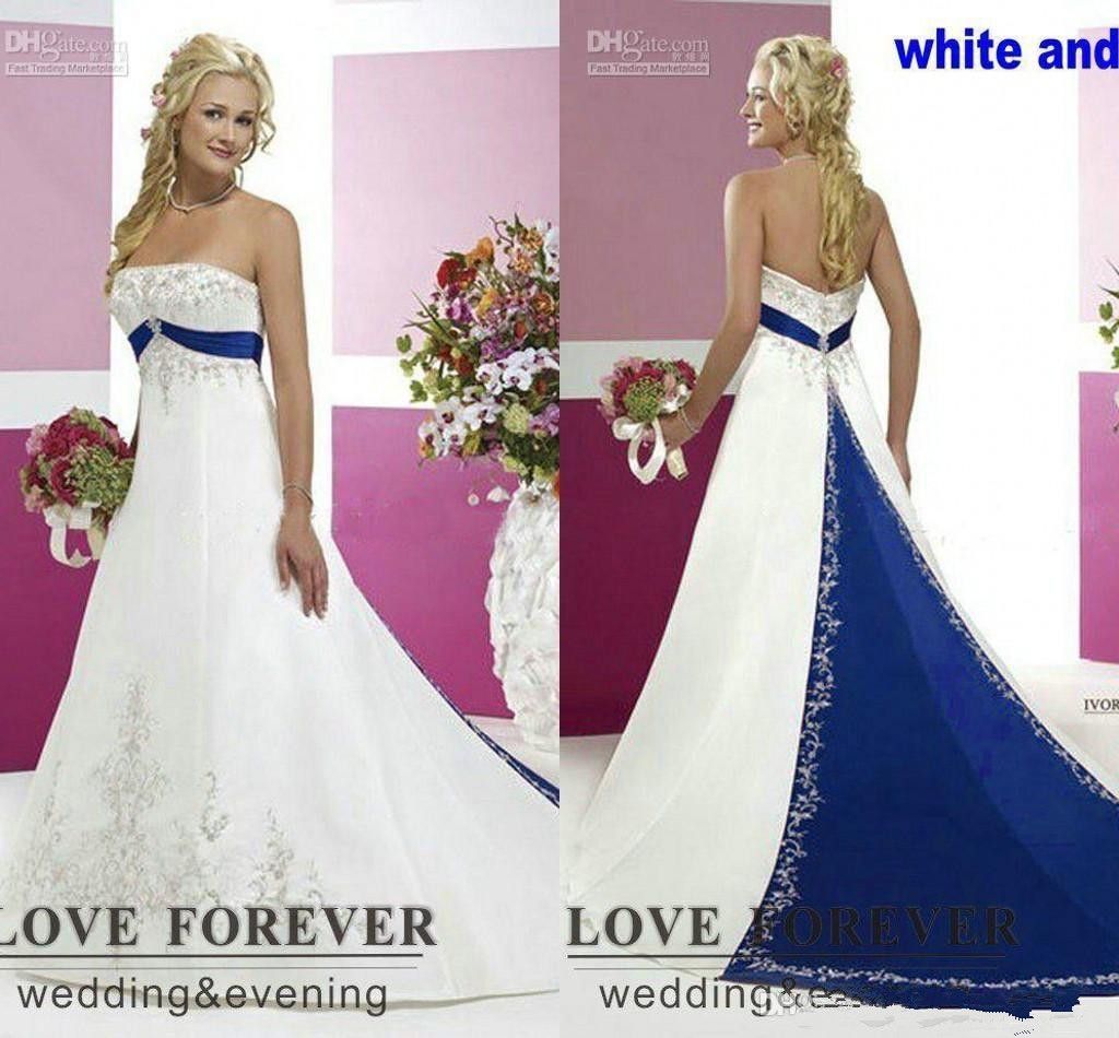 Discount 2018 Vintage Country Plus Size Wedding Dresses Silver Embroidery On Satin White And Royal Blue Lace Up Two Tone Bridal Gowns Cheap Halter A