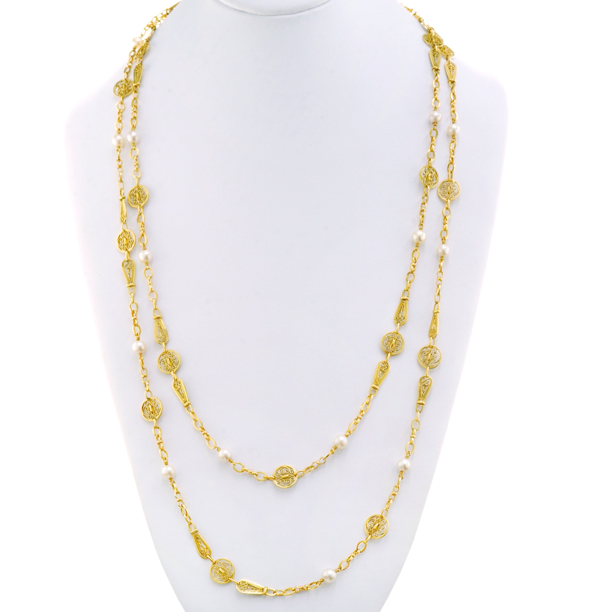 60 Inch Antique Pearl Set Gold Filigree Chain Necklace For Sale At